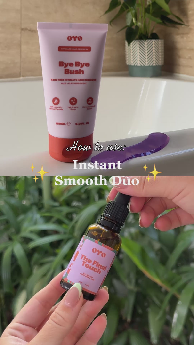 Hair removal doesn’t have to be a hassle. The Instant Smooth Duo is your shortcut to hair-free, happy intimate skin. Bye Bye Bush removes hair quickly and gently, then The Final Touch Oil steps in to calm, nourish, and smooth things out. Gentle, simple, and made for the areas that need extra care.